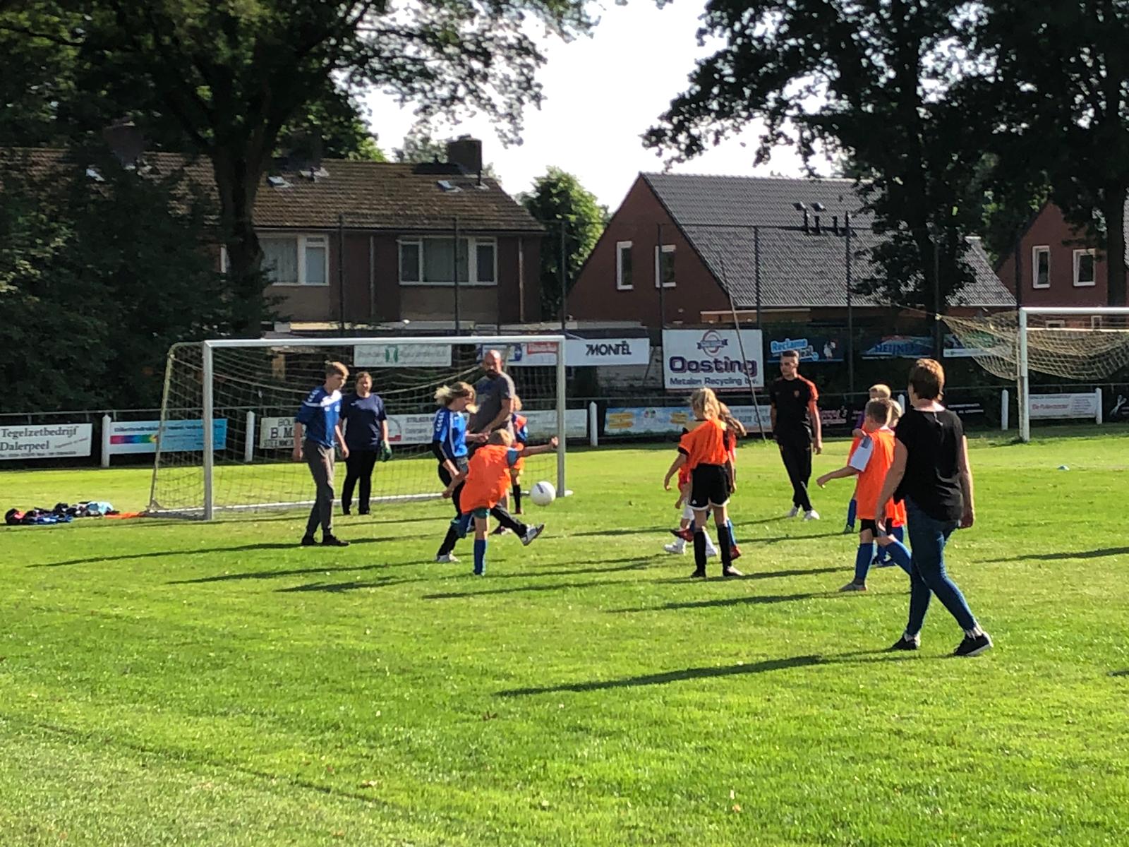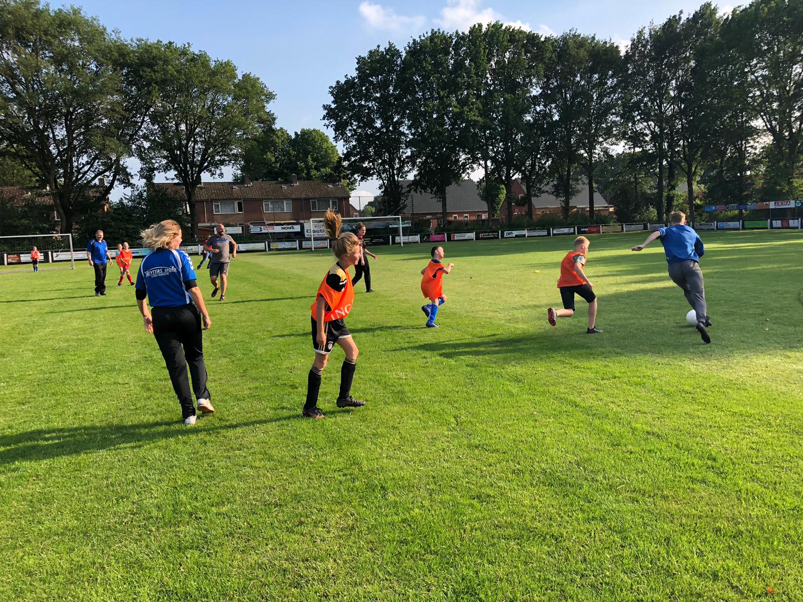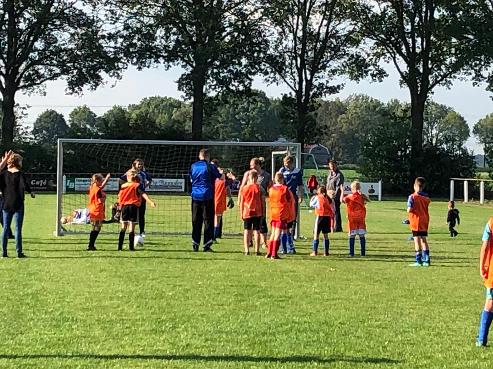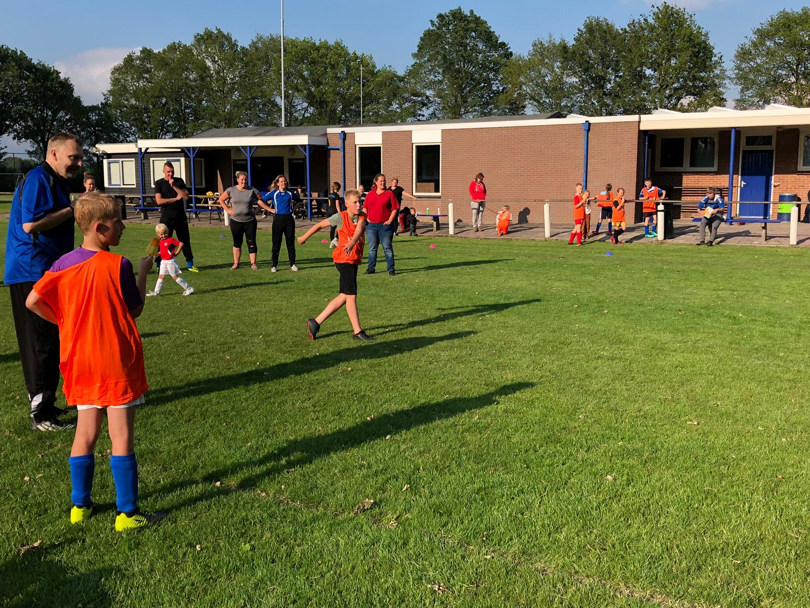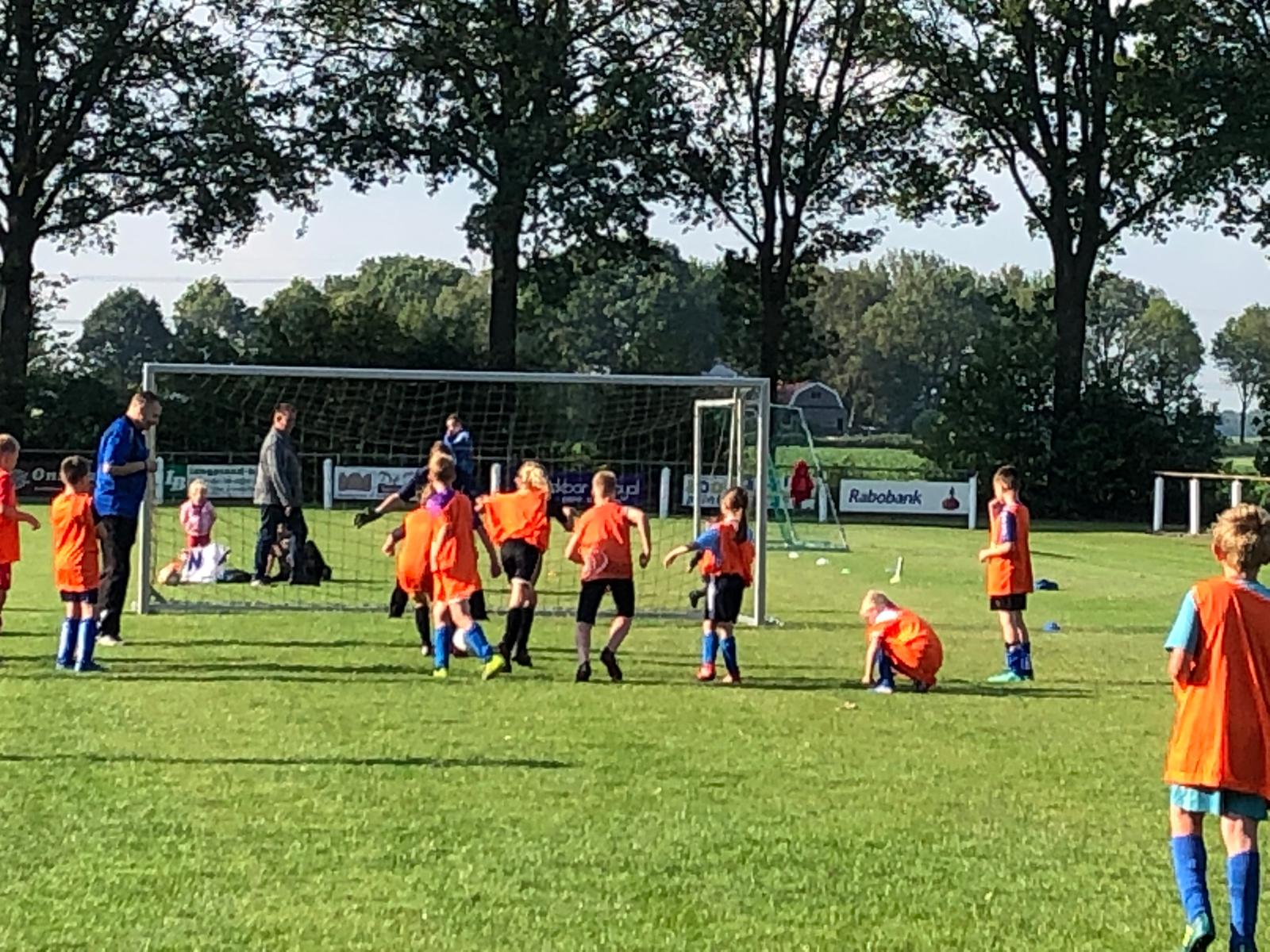 Na een warming-up van beide teams, kon de leidsman van vandaag voor aanvang fluiten. Team JO10, vandaag speciaal gehuld in het Oranje, begon fanatiek aan de wedstrijd. Gelijk vanaf de aftrap was het Brechje Timmer die het spel opende aan de rechterkant. Milan Fik benutte de ruimte die werd gelaten door team Blauw, ofwel de oudjes, en gaf het leer netjes voor op Sven Koops. Die liet het net bollen en zo stond het al snel 1-0.