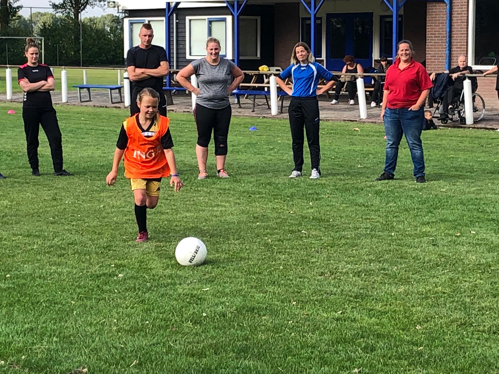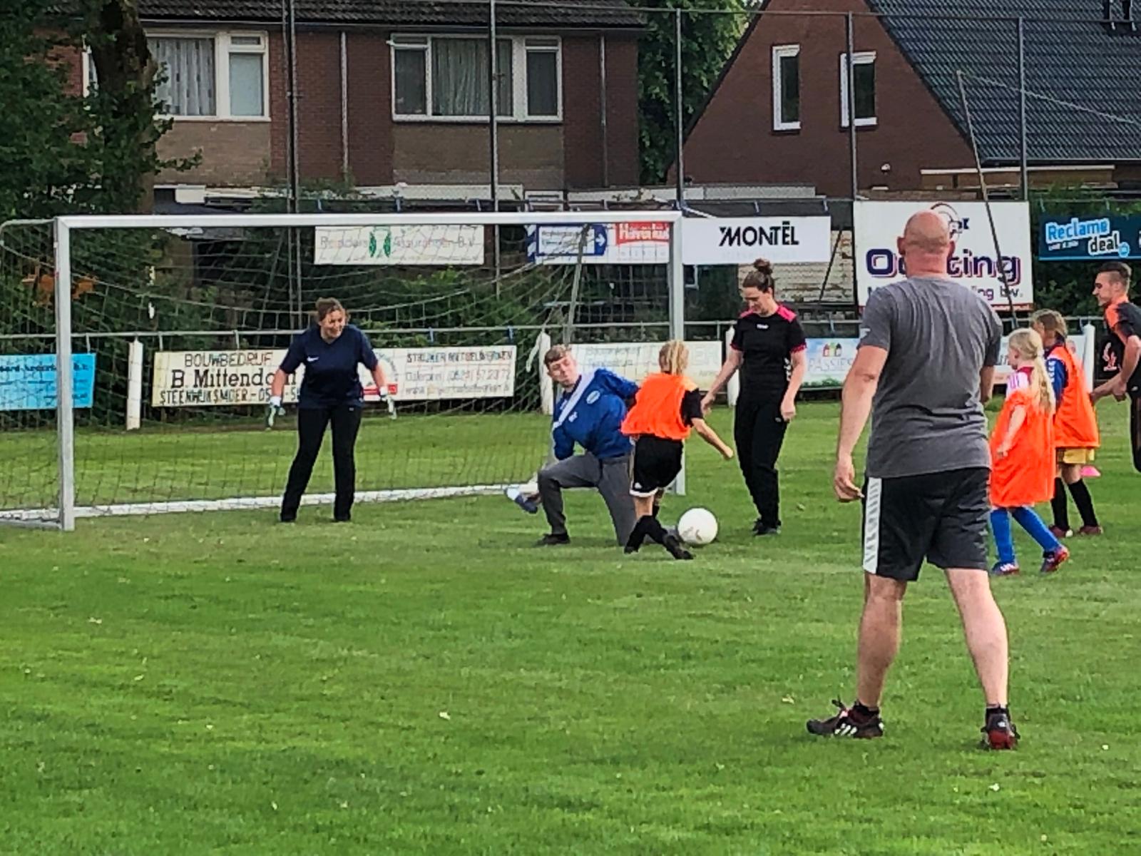 Team Oranje gaf het echter niet op. Het creëerde kansen en met name Ilse Hilbink en Robin Veldhuis wisten deze aanvallen via de noodrem te stoppen. Het was dan ook terecht dat Veldhuis de rode kaart kreeg voorgehouden van Veldhuis, zij het na twee keer geel. Trefzekere Elysha Geuzinge wist vanaf de penaltystip raak te schieten. Wel na twee pogingen aangezien vijf spelers van team Ouders te vroeg inliepen. Elysha liet zich hierdoor niet van de wijs brengen en scoorde alsnog de 4-4.