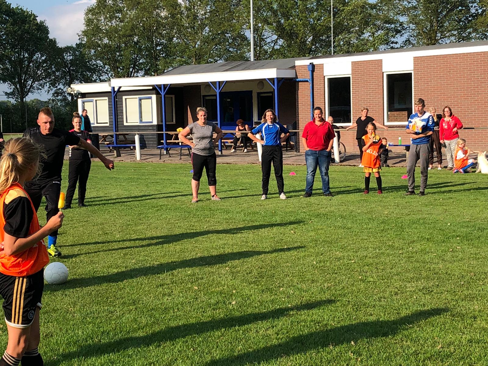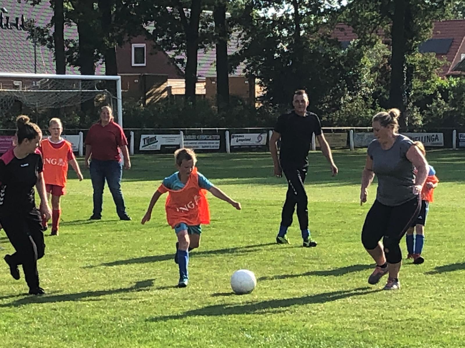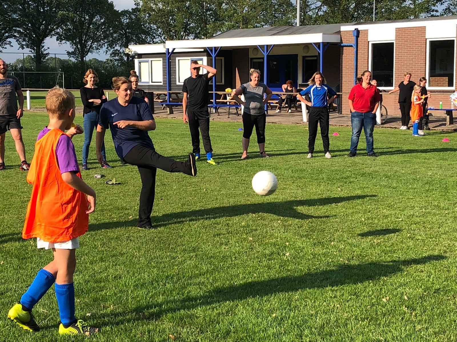 De ouders waren echter niet van plan, al was het maar voor de leuk, om de kids te laten winnen. Martine Dekker stormde met volle kracht vooruit en passeerde pardoes drie jeugdspelers. Een ongelukkig liggend takje deed de bal curven en uitkomen voor de voeten van Hilde Koops. Zij raakte, tot enthousiasme van het publiek het leer volkomen verkeerd. Helaas had ook keeper Jurre Luttikhuis de slappe lach en kon hij de bal niet voldoende keren. Zo kon vrouw Hilde alsnog juichen en met een snoekduik vierde zij haar eerste internationale treffer. De 2-2 was geboren.