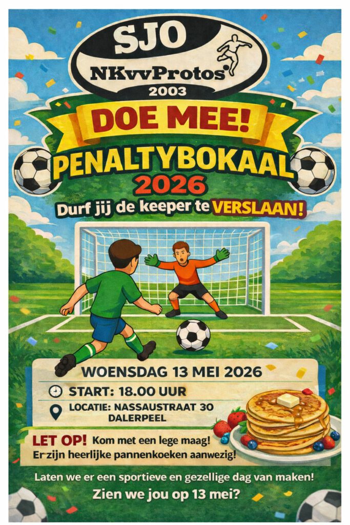 Woensdag 13 mei 2026 kent NKvvProtos de traditionele Penaltybokaal. Op het sportpark van NKVV zullen alle jeugdspelers zich verzamelen om daarna te proberen zoveel mogelijk penalty`s te scoren.